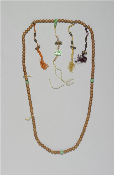 菩提珠計一百零八顆,每二十七顆間一珊瑚佛頭,頂端一佛頭塔,下貫紅白米珠、金剛杵、與翡翠方形背雲,上有曲線紋,記捻三串,皆串十顆金屬扁珠與金剛杵為墜腳。