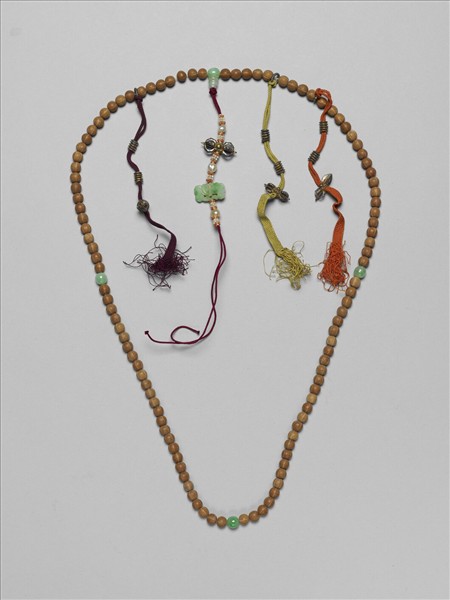 菩提珠計一百零八顆,每二十七顆間一珊瑚佛頭,頂端一佛頭塔,下貫紅白米珠、金剛杵、與翡翠方形背雲,上有鏤空紋飾,記捻三串,皆串十顆金屬扁珠與金剛杵為墜腳。
