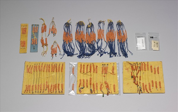 珊瑚記捻,以藍縧串起,飾以紅白米珠與鈕釦結。