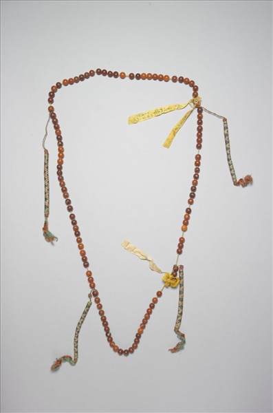 蜜蠟數珠計一百零八顆,以黃縧帶穿繫之;記捻四串,以綠絲線纏繞成管狀,並有黃、紅、金線編成格紋裝飾之。