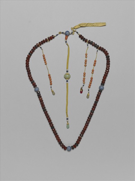 蜜蠟朝珠計一百零八顆,色澤呈暗紅,珠身雕成多邊形,每二十七粒間一催生石佛頭,色藍白間雜,頂端之佛頭連珊瑚佛頭塔一,下方以黃縧帶繫綠石背雲與墜角,其上分別陰刻團壽紋與菊花紋;記捻三串,每串貫以八顆珊瑚珠,與紅寶石或灰石墜角。