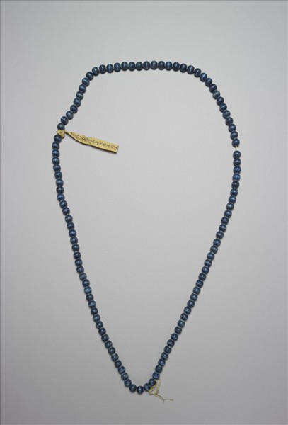 青石朝珠計一百零八顆,以黃縧線穿繫,光素無紋。