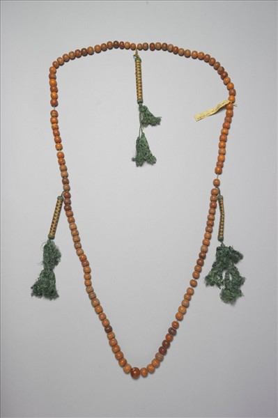 蜜蠟數珠一串計一百二十二粒,以黃縧帶穿繫之,管狀記捻三處,以綠絲線纏繞為底,並有紅、黃、金三色絲線編織成格紋裝飾之。