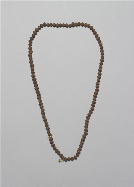 金剛子念珠一串計一百零五粒,表面粗糙呈不規則狀,以紅棉線穿繫之。