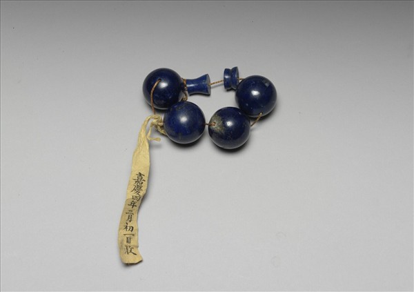 青金石佛頭四粒與佛頭塔一個為一串,色深藍,以橘棉線穿繫之。