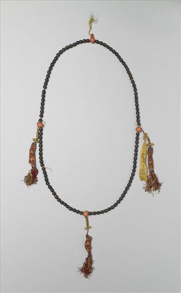 椰子念珠四串共計一百零八粒,有珊瑚佛頭三,佛頭塔一,記捻三,串有十顆童鍍金珠與金剛杵墜角,下有織鏽流蘇。