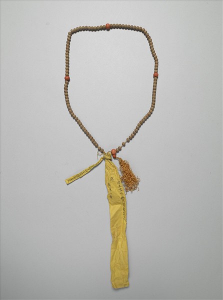 白檀念珠一串計一百零八粒,每隔二十七粒間一珊瑚佛頭,共四粒,其一帶佛頭塔一與橘色絲穗。