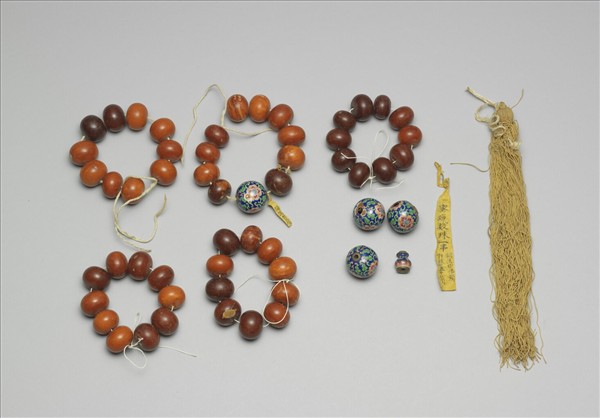 蜜蠟數珠,一串以散脫,有銅琺瑯彩佛頭與佛頭塔及黃色線穗一。串珠由十粒蜜蠟珠與一粒銅琺瑯彩佛頭組成,琺瑯佛頭上描繪紅花與綠葉。串珠與流蘇未知有無組合關係。