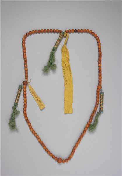 蜜蠟朝珠一串計一百零八粒,頂端串佛頭一,往兩側下數二十七粒亦間佛頭各一,管狀記捻三處,以綠絲線纏繞為底,並有黃、橘、金線編成格紋裝飾之。