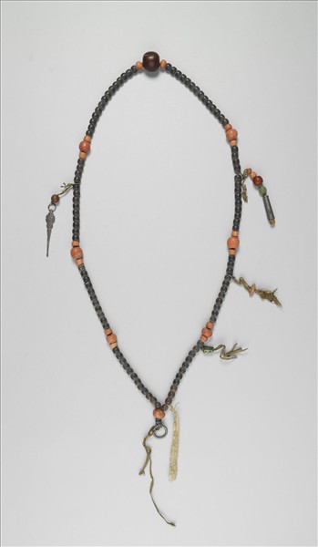 此件由一百零八粒木子小珠組成,每十四粒以珊瑚圓珠分隔。兩側接銀綴飾。