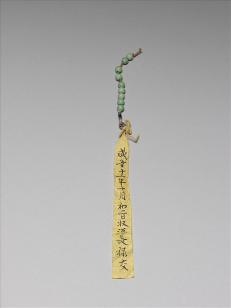 記捻常串於朝珠兩側,此為松石記捻,九顆一串,上皆綴飾及黃縧線。
