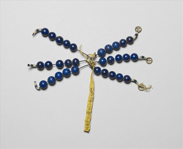 記捻常串於朝珠兩側,此為青金石記捻,五顆一串,共六串,有三串後接金色圓環。