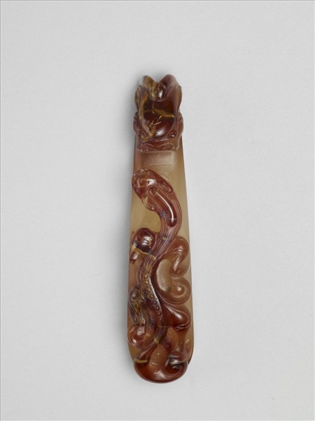 鉤作獸首形,面琢立雕蟠螭,螭首上揚,身軀扭轉呈s形,動感十足,底有圓柱。全器瑪瑙呈波紋狀帶褐紅色。
