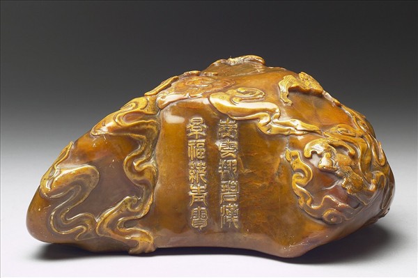 田黃石,半透明深淺蜜黃色,石質細潤微有瑕紋。立雕一山,山勢依石形發展,連綿起伏,其上淺浮雕蝙蝠與各色雲紋。一側凸雕詩文「慶雲翔碧漢,景福繞青霄。」並貼有「養心殿」黃籤。