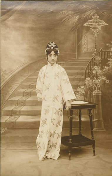 紙本,黑白照片。照片中的主角為宣統皇帝溥儀(1906-1967)之妻婉容(1906-1946)。溥儀在三歲即位,宣統三年(1911)退位,中華民國成立﹔直到民國十三年底之前,一直擁有紫禁城內的小朝廷﹔至其離開紫禁城,故宮博物院乃成立。小朝廷的生活為前朝遺老所包圍,大致仍保持前清宮廷生活的步調﹔民國十一年(1922)依然以清代選秀女的方式,依相片點選內務府大臣榮源之女婉容為皇后,知府端錦之女文繡(1910-1953)為淑妃,並於二月一日舉行大婚之禮﹔當時婉容十七歲,與溥儀同年,可謂中國歷史上的最後一位皇后。此張照片為北京容光照相行所拍攝,時間當在民國十三年底之前,婉容年未二十。背景為當時流行的西式佈置,所著寬身旗袍為當時的時尚,然髮髻作舊式裝扮﹔髮上珠花為鳳鳥形,身上衣料為松枝與雀鳥圖案,都依稀維持法制上屬於皇后的儀服。