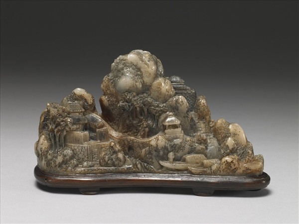 軟石,類壽山石系,色白中帶灰褐斑,部分染黑色。雕成山水景,主峰旁有城地,下接山徑、小亭、屋宇、橋梁、漁舟、人物或行或坐或?其間。背面則有田疇數畦,農夫耕種。雕工疏簡,但仍承研山之意。右側直行刻款︰「海陽汪洙」四字,下具一長方印,印文不識。汪洙,不識為何人,海外收藏之其它作品亦均為壽山石雕,雕法相近,可能為清中葉的工藝家。海陽,即廣東潮安。