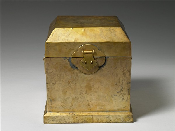 銅鍍金盝頂掀蓋式印匣,以如意形鎖片扣合,兩側有環耳,內有一方形銅托,以放置故雜7863金印。