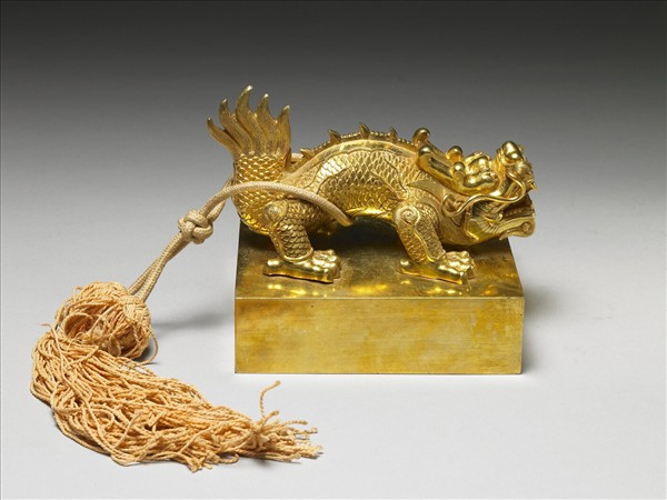 銅鍍金製方形印璽,印鈕作龍紋,繫黃?,印身周邊光素,印面雕篆書及滿文:「榮惠皇貴妃之寶」。帶銅鍍金盝頂印匣,內有一銅托,另附一鎖、一黃袱,二錦墊。榮惠皇貴妃為清穆宗同治皇帝的?嬪,西林覺羅氏,同治十一年初封?貴人,十三年進為嬪,光緒二十一年間晉封為妃,三十四年尊封為皇考?貴妃。遜國後,民國二年,加封為榮惠皇貴妃;十一年溥儀婚後稱為太妃,民國十三年溥儀出宮後不久,於十一月二十一日出宮,移居榮壽固倫公主(恭親王奕訢長女)家。