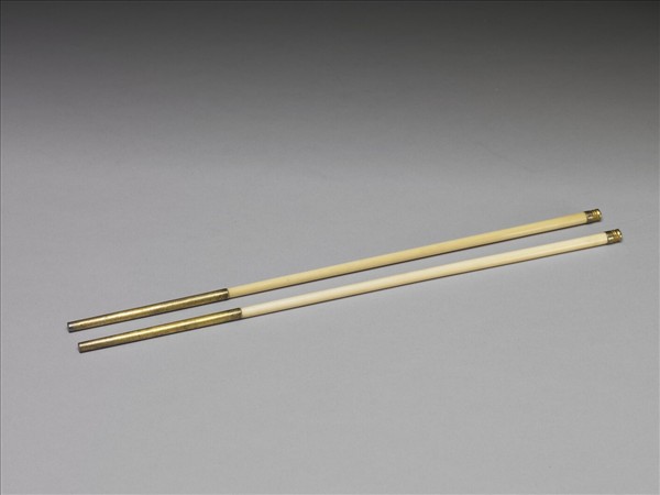 象牙製作,頭部略細至尾部漸粗,頭部套有金套子,尾部套一弦紋裝飾,通體光素。
