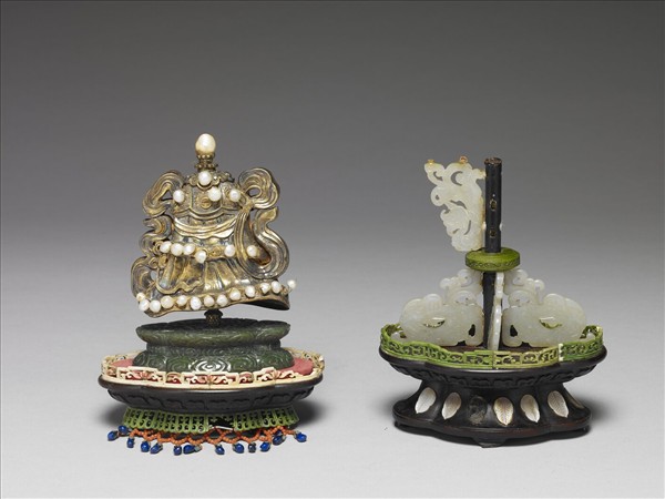 銅鍍金嵌珠寶傘,蓋頂及單面嵌珠,未嵌珠處鏨刻蝙蝠紋、波濤紋及卷葉紋,兩側飾飄帶。置於海棠形青玉墩之上,玉上雕滿雲紋,玉下為海棠形蓮瓣紋木座,嵌象牙蓮花欄杆、鏤雕綠色染骨蓮瓣紋邊飾及珊瑚米珠纓絡墜藍色料石墜角;其下承以木質圓柱,以中央綠色染骨雲紋環為界,上下各嵌四隻白玉夔龍;底座為海棠形木座,其上嵌綠色染骨鏤雕海棠、拐子龍紋欄杆,座邊嵌羅鈿葉片。故雜007871N000000000~故雜007878N000000000為一組。