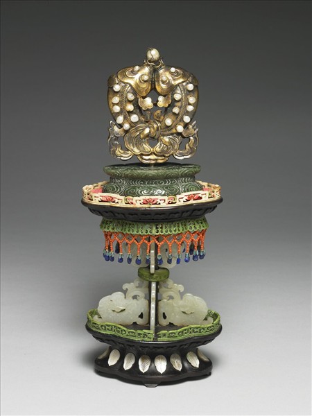 銅鍍金嵌珠雙魚,二魚吻共頂一珠,魚眼、背皆嵌珠為飾,尾部交叉並以飄帶繞繫, 另一面為魚腹,光滑無紋。置於海棠形青玉墩之上,玉上雕滿雲紋,玉下為海棠形蓮瓣紋木座,嵌象牙蓮花欄杆、鏤雕綠色染骨蓮瓣紋邊飾及珊瑚米珠纓絡墜藍色料石墜角;其下承以木質圓柱,以中央綠色染骨雲紋環為界,上下各嵌四隻白玉夔龍;底座為海棠形木座,其上嵌綠色染骨鏤雕海棠、拐子龍紋欄杆,座邊嵌羅鈿葉片。故雜007871N000000000~故雜007878N000000000為一組。