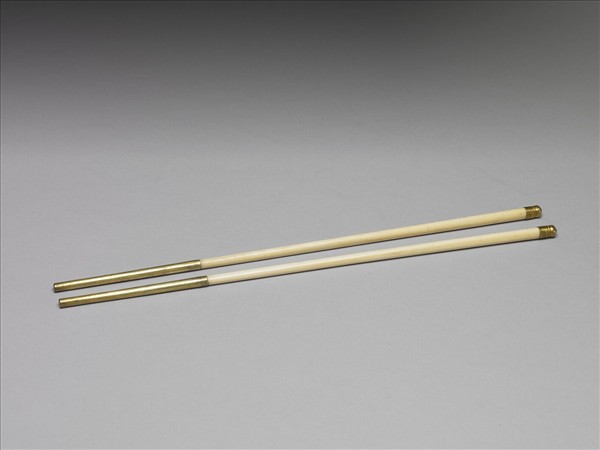 象牙製作,頭部略細至尾部漸粗,頭部套有金套子,尾部套一弦紋裝飾,通體光素。