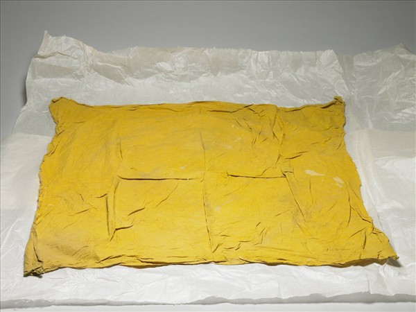 由兩層黃色絲質布料製作,長方形,平素無紋,一角縫有布環。