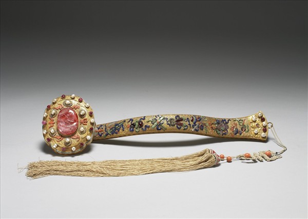 通體皆加紋飾:正面為斜卍字地紋,邊側為連續回紋,背面為盤枝番蓮嵌雕八寶。正面首部中央鑲一橢圓形紅色碧璽,周圍繞以珍珠十五顆,及碧璽小圓珠九顆。珊瑚蝙蝠五,下方鑲一珊瑚壽字。柄面鑲八仙所持標誌物,自上而下玉扇(漢鐘離)玉笛(韓湘子)、碧璽葫蘆(李鐵拐)、松石漁鼓(張果老)、碧璽雙板(曹國舅)、松石劍(呂洞賓)玉花籃(藍采和)、玉花(何仙子)。尾鑲珍珠六顆及紅碧璽兩顆。下垂土黃壽字編花雙穗。