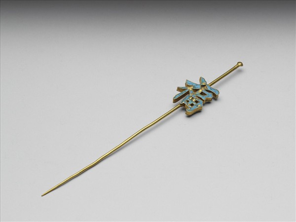 金耳挖簪,一端鋌素長,一頭末端圓凹如耳挖。簪首鑄作福字,兩面點翠,部份點翠脫落。