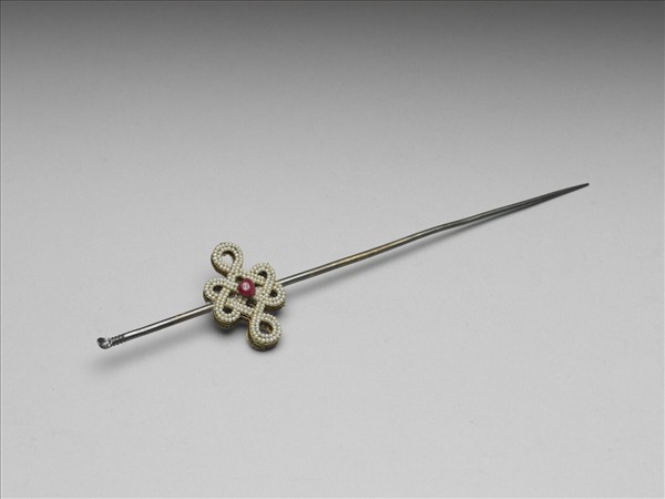 銀鍍金耳挖簪,一頭末端圓凹如耳挖,一頭鋌素長。簪首為盤長結,以纍絲金條折成盤長形,兩面嵌飾珍珠,中心鑲紅色碧璽,造形簡單素雅,為明清時期流行的首飾之一。