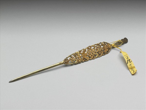 鍍金簪,一端鋌扁長,一端從簪首頭起出長葉形飾。簪首鑄鏤空吉祥紋飾,有如意雲頭、蝙蝠、古錢紋、盤長結、桃實、卍字及團壽字,寓意「福壽萬年如意」。