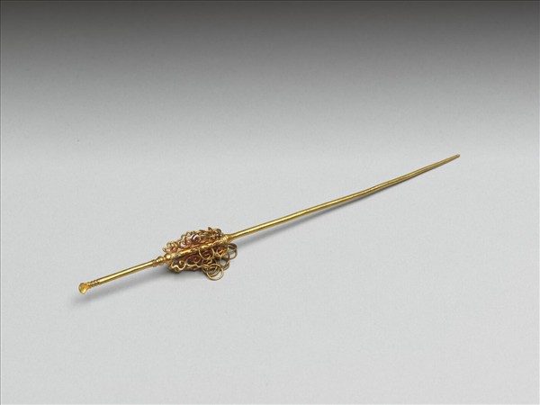 鍍金耳挖簪,一頭鋌素長,一頭末端圓凹如耳挖。簪首鑄數個以金屬線折成的如意雲頭,其上串飾金屬連環,造形簡單大方。