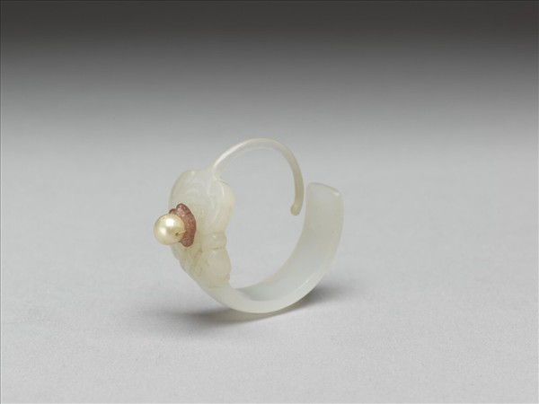 玉耳環,呈圓弧形,一端琢細長形作耳針。環面雕蝙蝠及盤長結,中心嵌碧璽座珍珠,寓意「福氣綿長」。造形簡單素雅,為清代常見耳飾之一。