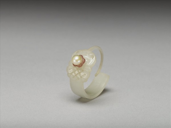 玉耳環,呈圓弧形,一端琢細長形作耳針。環面雕蝙蝠及盤長結,中心嵌碧璽座珍珠,寓意「福氣綿長」。造形簡單素雅,為清代常見耳飾之一。