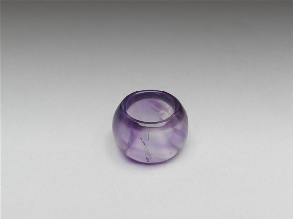 戒指又稱為指環、手記、約指、彄環或纏子。這件戒指通體由紫晶雕琢而成,圓稜,光素無紋。質地透明,帶紫色紋路,有細璺。