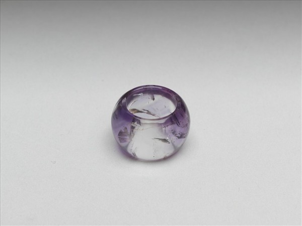 戒指又稱為指環、手記、約指、彄環或纏子。這件戒指通體由紫晶雕琢而成,圓稜,光素無紋。質地透明,帶紫色紋路,有裂璺。
