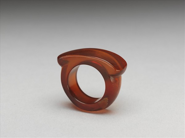 馬鞍形戒指,通體由琥珀雕琢而成,戒面為長弧形凸出戒環。琥珀質地通透,表面帶細璺。