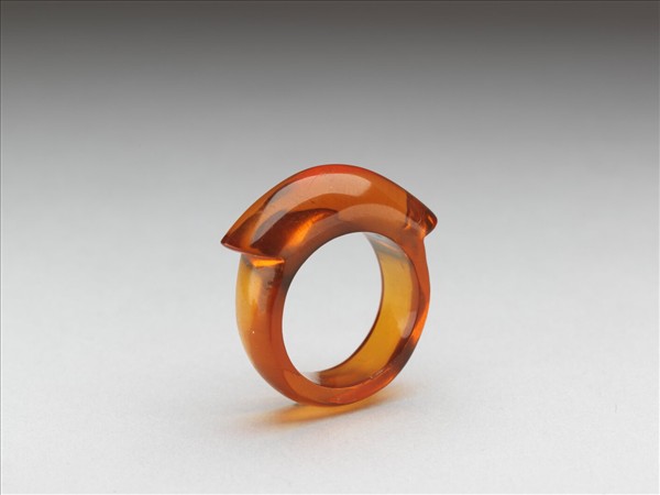 馬鞍形戒指,通體由琥珀雕琢而成,戒面為長弧形凸出戒環。琥珀質地通透,表面帶細璺。