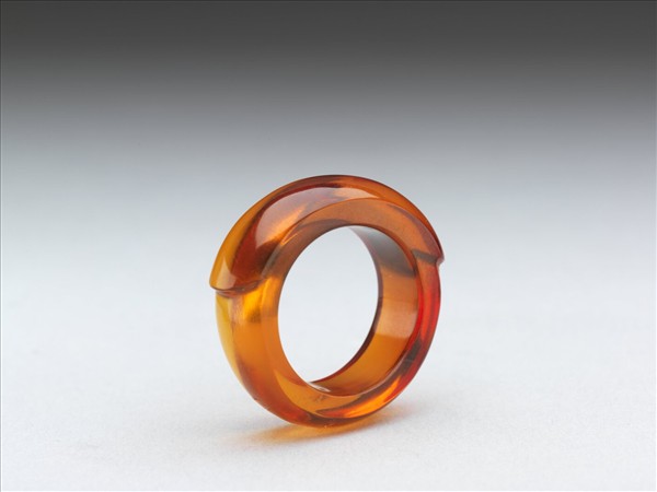 馬鞍形戒指,通體由琥珀雕琢而成,戒面為長弧形凸出戒環。琥珀質地通透,表面帶細璺。