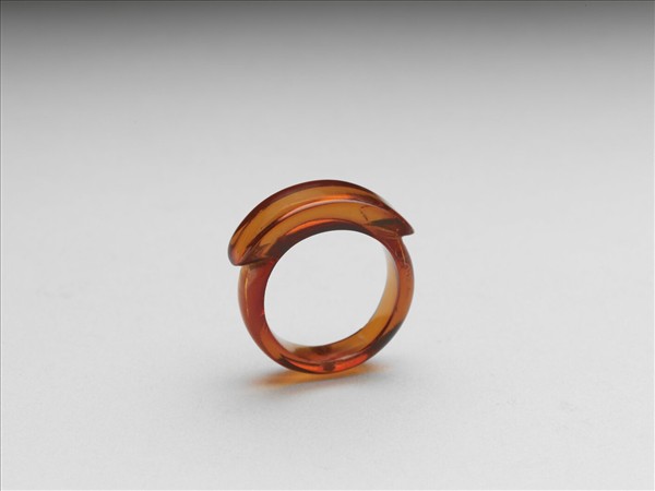 馬鞍形戒指,通體由琥珀雕琢而成,戒面為長弧形凸出戒環。琥珀質地通透,表面帶細璺。