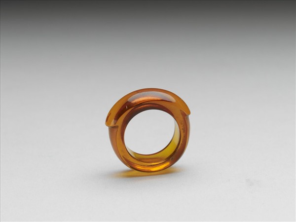 馬鞍形戒指,通體由琥珀雕琢而成,戒面為長弧形凸出戒環。琥珀質地通透,表面帶細璺。