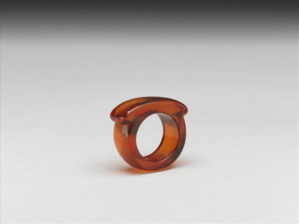 馬鞍形戒指,通體由琥珀雕琢而成,戒面為長弧形凸出戒環。琥珀質地通透,表面帶細璺。