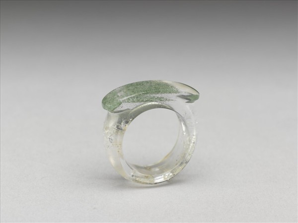 馬鞍形戒指,通體由水晶雕琢而成,戒面為長弧形凸出戒環。水晶質地透明,有璺有綹,帶綠色礦物質。
