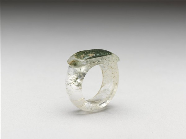 馬鞍形戒指,通體由水晶雕琢而成,戒面為長弧形凸出戒環。水晶質地透明,有璺有綹,帶綠色礦物質。