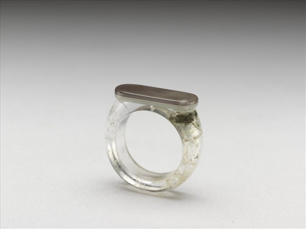 馬鞍形戒指,通體由水晶雕琢而成,戒面為長弧形凸出戒環。水晶質地透明,有璺有綹,帶綠色礦物質。