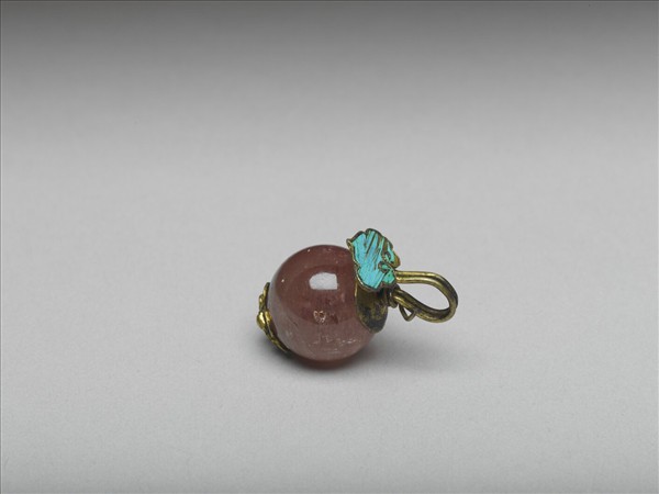 鈕頂層為綠點翠如意掛勾,底雙層係綠點翠花瓣紋,粉色碧璽作鈕身,帶瑩潤光澤。鈕為服飾的衣料配件,金屬部件之點翠部分脫落。