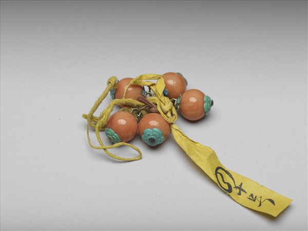 鈕頂層為點翠花形掛勾,底部串花瓣形綠松石飾件,珊瑚作鈕身,橘紅色,帶有樹木年輪般的層狀環紋。此組五件(故雜8076-故雜8080)一套,為服飾的衣料配件。