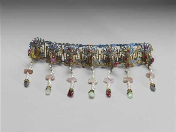 以鳳為單元組合成的鳳鈿,華麗異常。包含頭頂上最大面積的鈿尾、額間五片長形鈿花、正中央展翅的鳳鳥、兩側各一片橫長形鈿花,以及眉上垂著流蘇的鈿口。鳳鳥的尾部為點翠嵌寶石,雙翅以珠串表現平行的線條,再連接挺立的金纍絲鳥首及鳥身,結構清晰,整齊有序。每一隻鳳鳥嵌飾的寶石不全然相同,更增加炫麗的光彩。
