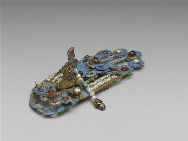 以鳳為單元組合成的鳳鈿,華麗異常。包含頭頂上最大面積的鈿尾、額間五片長形鈿花、正中央展翅的鳳鳥、兩側各一片橫長形鈿花,以及眉上垂著流蘇的鈿口。鳳鳥的尾部為點翠嵌寶石,雙翅以珠串表現平行的線條,再連接挺立的金纍絲鳥首及鳥身,結構清晰,整齊有序。每一隻鳳鳥嵌飾的寶石不全然相同,更增加炫麗的光彩。