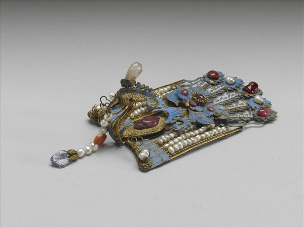 以鳳為單元組合成的鳳鈿,華麗異常。包含頭頂上最大面積的鈿尾、額間五片長形鈿花、正中央展翅的鳳鳥、兩側各一片橫長形鈿花,以及眉上垂著流蘇的鈿口。鳳鳥的尾部為點翠嵌寶石,雙翅以珠串表現平行的線條,再連接挺立的金纍絲鳥首及鳥身,結構清晰,整齊有序。每一隻鳳鳥嵌飾的寶石不全然相同,更增加炫麗的光彩。